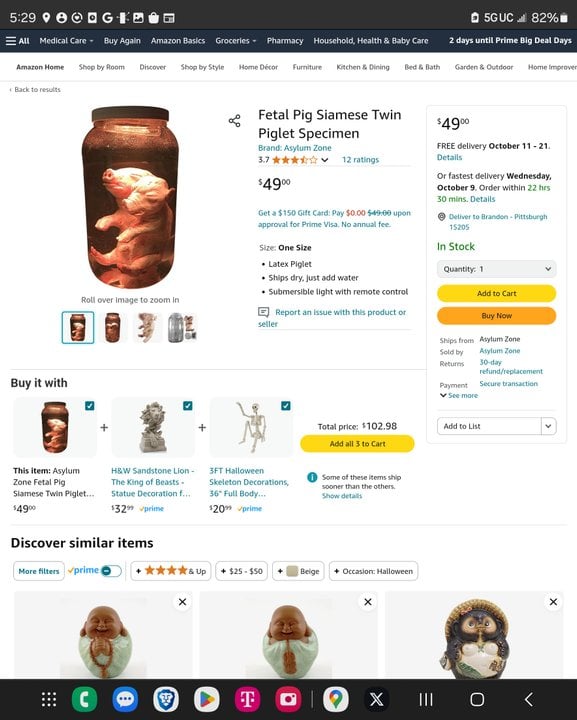 @4meAndyou I remember I was looking at the weirdest stuff on amazon.com, stuff if you order you should get a humorous knock at the door by the FBI. One was jared pig embryos, and I added leather a BDSM leather face mask, then radioactive particles (used to test geiger counters and alarms), and I can't remember what the fourth thing was. Might of been a whip or flame thrower.