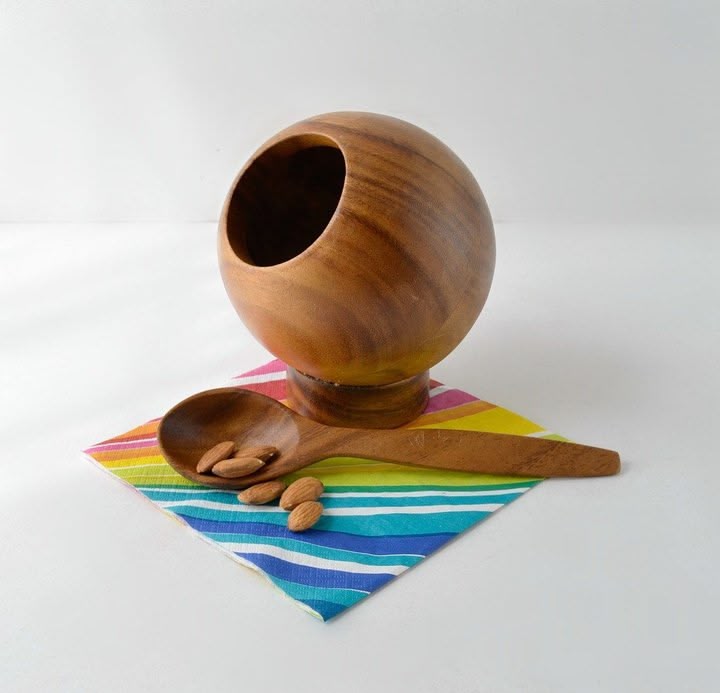 I had one and filled it with pecans I had picked up. I also had a male Siamese cat who would take a pecan out of it and put it on the wood floor and bat it around like he was playing soccer or something. It would go under the sofa or stove in the kitchen. Then he’d go get another one and start up again. And would eventually empty the bowl. I just let him have them all, and would get a yard stick and get them out from under the stove and move the sofas and collet them and put them all back in the bowl.