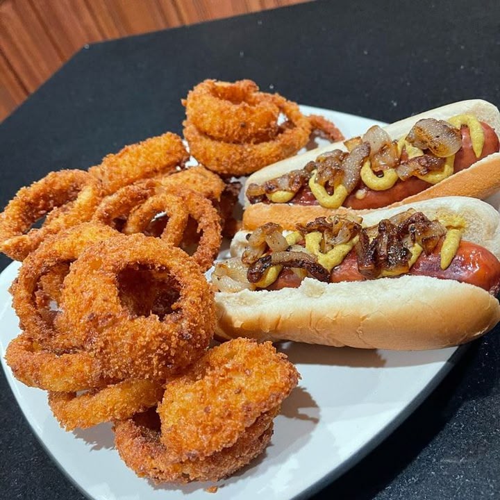 gimme the hot dogs and onion rings. hot dogs must have ketchup, mustard, mayo, onions, and guac on them. stuff some potato chips inside the buns too please