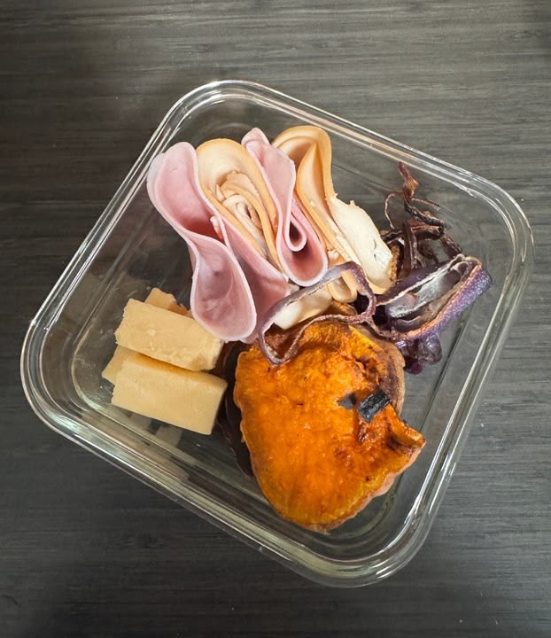 I’ll go first. Here’s my lunch & dinner I’ve packed for work. I have baked sweet potato slices and onions, Gouda cheese, and some deli meat I found in the fridge.
