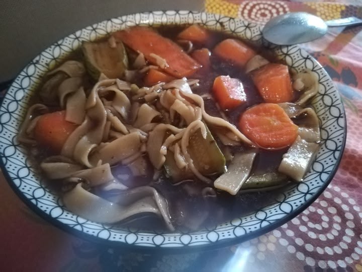 One of my kind of soups.. Carrots, zucchini, garlic, ginger, chilli flakes, olive oil, pasta made with egg. In the broth I added carob powder and soya sauce..:)