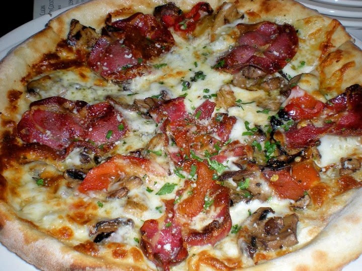 Mozzarella, provolone, hot coppa, roasted red bell peppers, grilled eggplant, mushrooms, pesto sauce