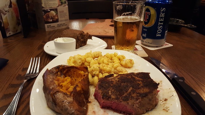 16 oz medium cooked Steak with cut green beans (cut, not French style green beans), shelled peas, buttered (spinach, broccoli, asparagus, corn), brown rice with sauteed red pepper, onions and shiitake mushrooms, mac n cheese, wonton noodles in soy sauce, fettuccini with Alfredo sauce, french fries with ketchup, mashed potatoes with brown gravy, spicy country fried potatoes, tater tots with ranch dressing, hash browns, refried beans and Boston baked beans.