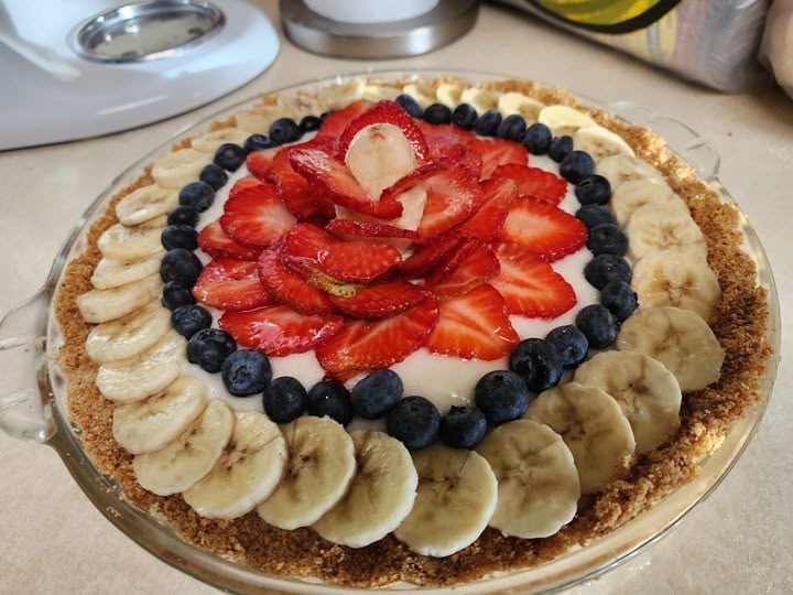 @ShenaniganFoodie fruit pizza is made on a sugar cookie crust atop a cream cheese and whipped cream topping.