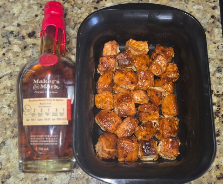 Had the oven going for some batch cooking and some tunes up .. Spicy Bourbon BBQ Salmon chunks and a couple fillets to boot.