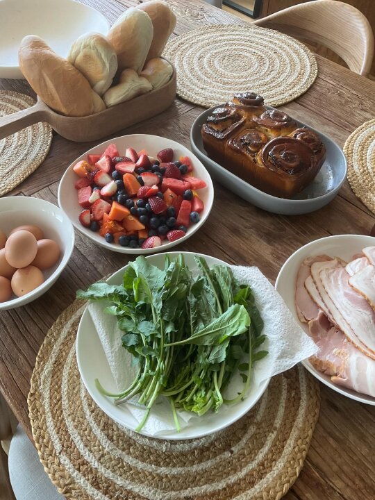 Fruit salad, burnt butter and date scrolls, eggs, bacon and continental rolls. I made the fruit salad, and helped with the scrolls.