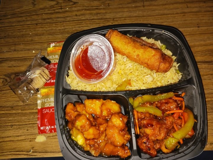 Chinese take out from the grocery store, had to get bread and milk, and going by this smelled good. Spicy General Tso's chixken, orange chicken, fried rice, egg roll, sweet and sour dipping sauce, and a fortune cookie.