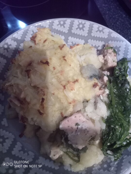 Update: Somebody asked for pics. These photos are of a similar fish pie I made tonight but the base was just spinach and it had smoked haddock, salmon and cod in it.