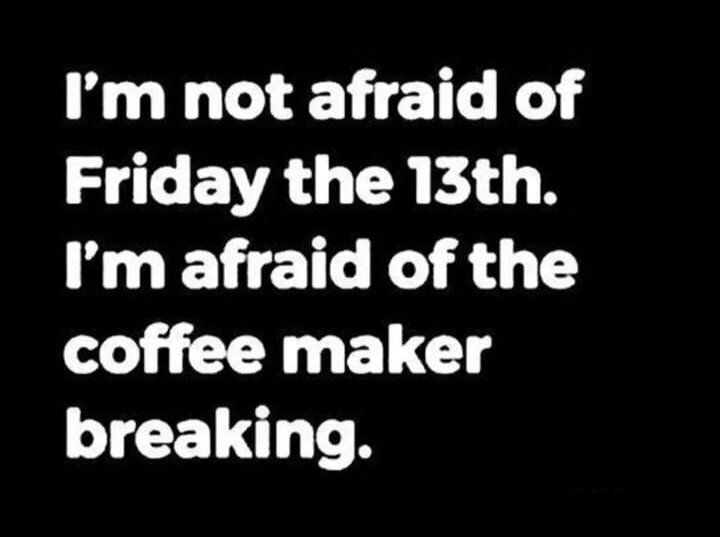 Yup coffee maker breaking trumps Friday the 13th... it's a SCARE!!! lol☠ (mine is on the fritz!!)Thank God I'm not superstitious of Friday 13th, or tomorrow would be Double trouble lol.