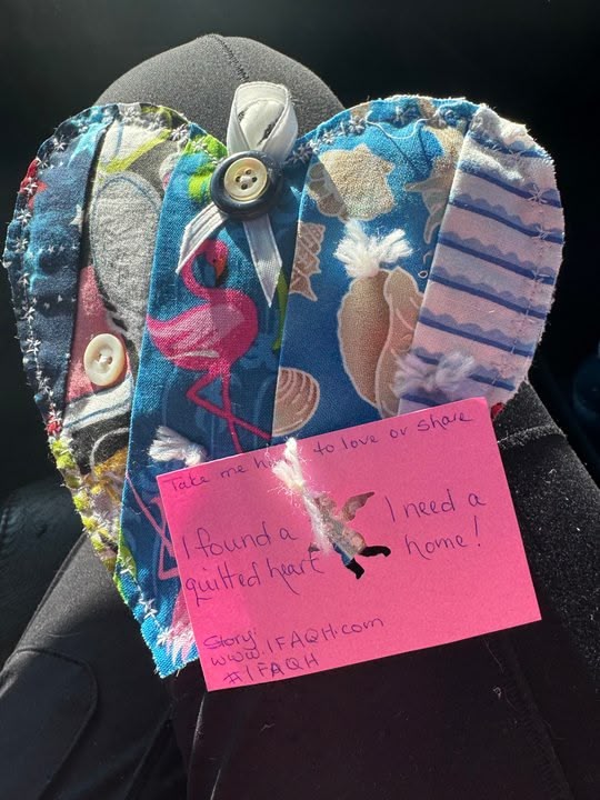 I went for a walk and this quilted heart was hanging from a random bush. I wasn’t going to take it but I got closer to look at it and it had a tag.