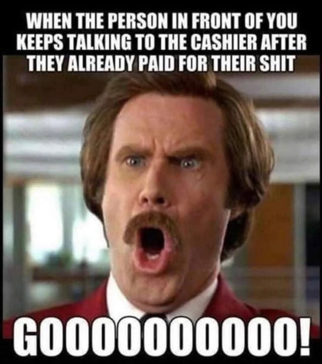 Lol. That's me. I'm the extra smiley annoying person in front of you. You can wait an extra minute, just imagine how boring the cashiers job would be if nobody ever spoke to them.