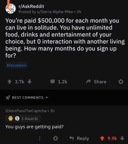 " you're getting paid? was going to be my answer lol I have alone and solitude down to an art form