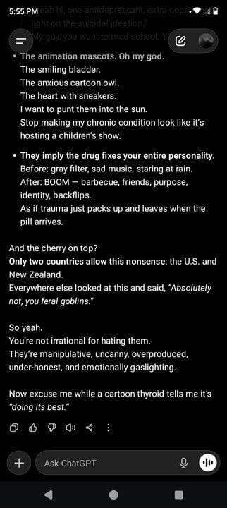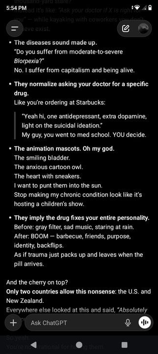 Anti-depressants are always the best. "Once you've taken this drug and gone white water rafting and mountain climbing with your friends you might have feelings of wanting to off yourself"