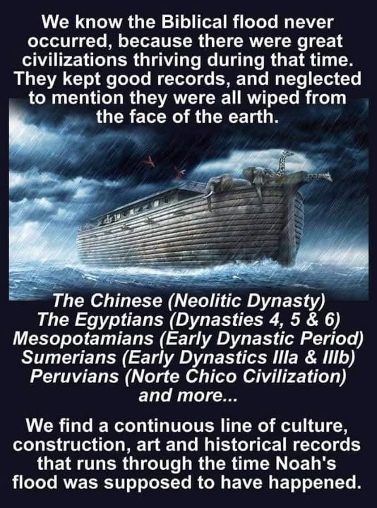 We know the Biblical flood never occurred, because there were great civilizations thriving during that time. They kept good records, and neglected to Post Comment Receive notifications Add a comment...