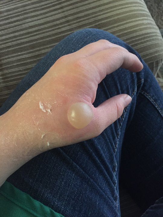 This thing you do with this type of burn and the area in which it's located is to immediately flush it under cold running water in the sink even before any other treatment.