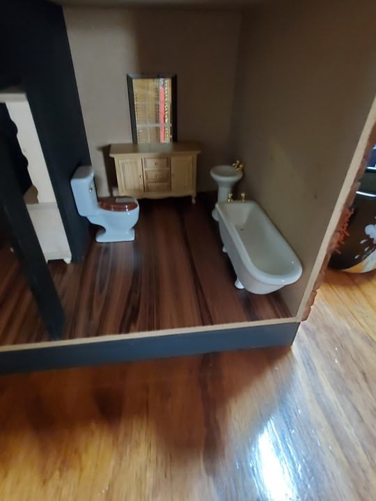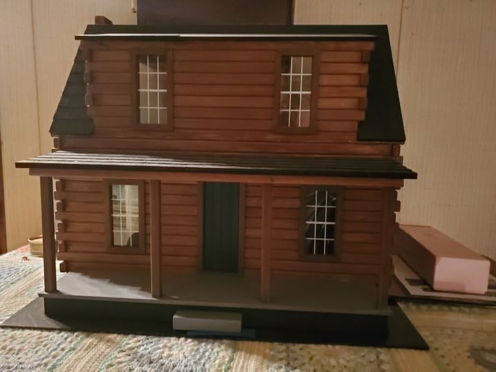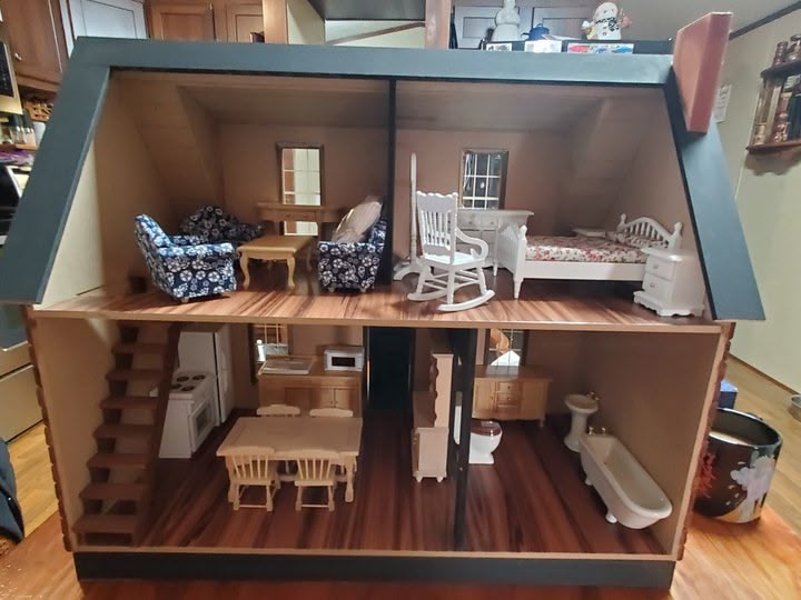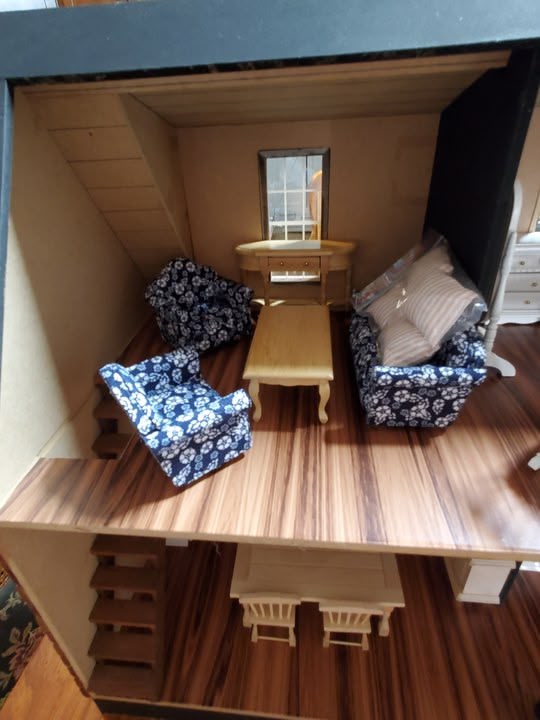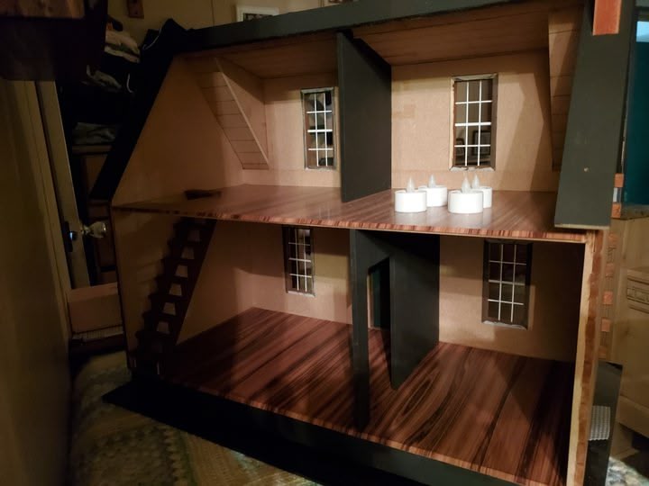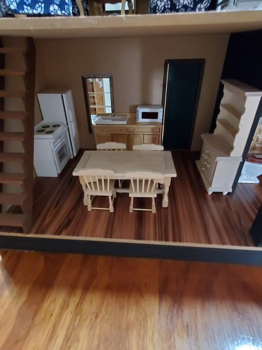 I put this cabin together a while back and it's just been sitting here so I decided to decorate the inside. This is just the furniture so far but still gotta put up wallpaper, lamps, door knob, and run power through it for the lights and then accessories like rugs and dishes and what nots then put the shingles on the roof then it'll be done. This is it so far. I think she'll like it.