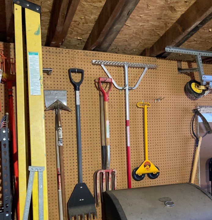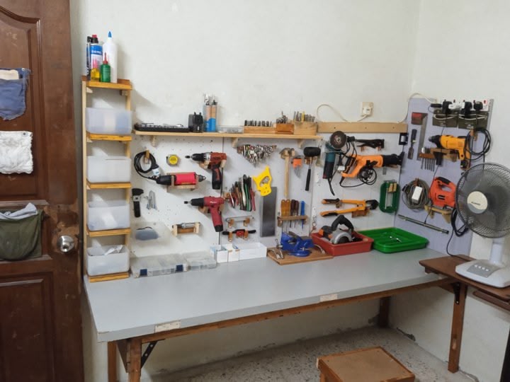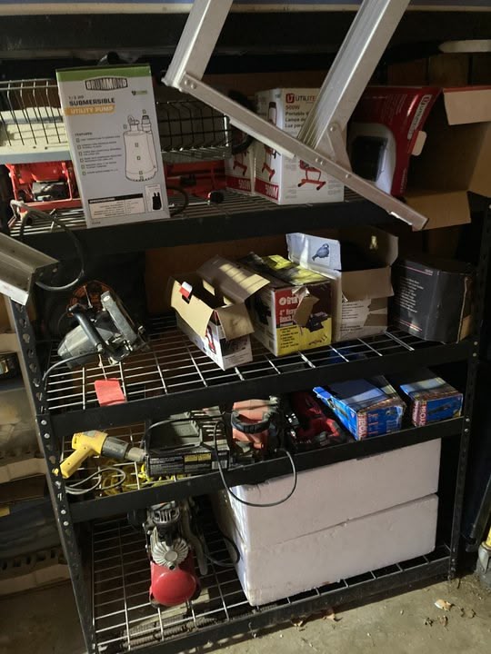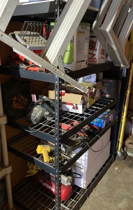 You got some heavy tools there I bought a heavy duty steel rack 4' wide 6' high 24" deep and put all my grinders buffers saws on it then peg board for hand tools