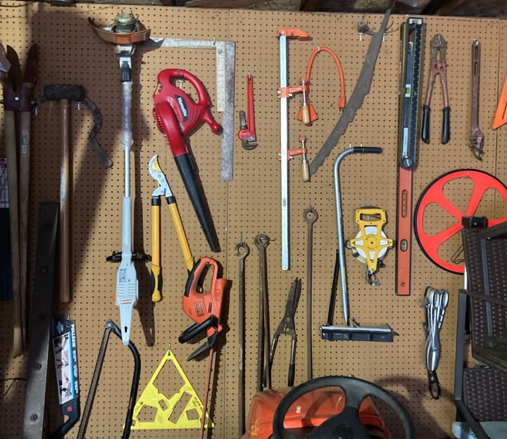 Hmmm, it's hard to really say from pics. Just cant tell what will dit where. Off the top of my head? Install peg board into the recessess and hang the tools with peg board hangers.