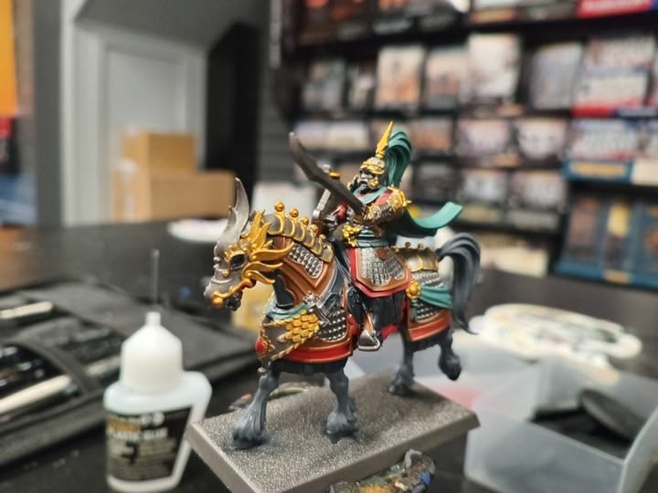 @MrBrownstone He's nearly done now. The Nuln Oil is on and then it's just brightening the green and red on the gem (I'm guessing it's a gem), then the skin tone, then the base and a varnish.