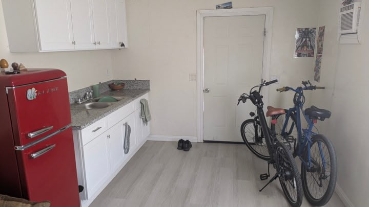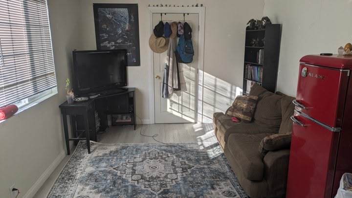 I love the retro looking red refrigerator. Congrats. You just need to update the bed to a bed frame now.