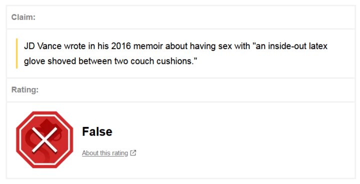 The claim was that Vance wrote about f—ing the sofa in his book, and I pointed out that Snopes disproved that claim.