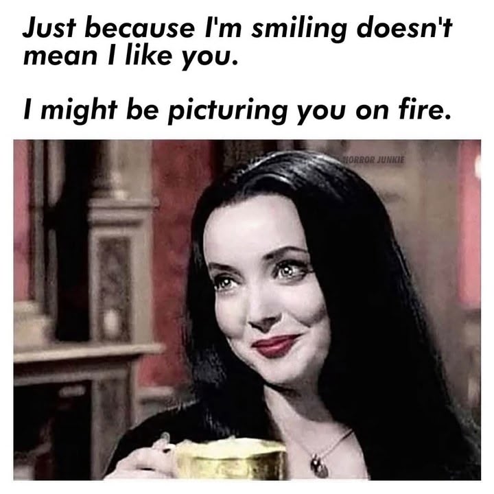 I always found this meme to be a bit of a oxymoron. Not saying that Morticia Addams couldn't set a person on fire. Only that she'd be so nice about it.
