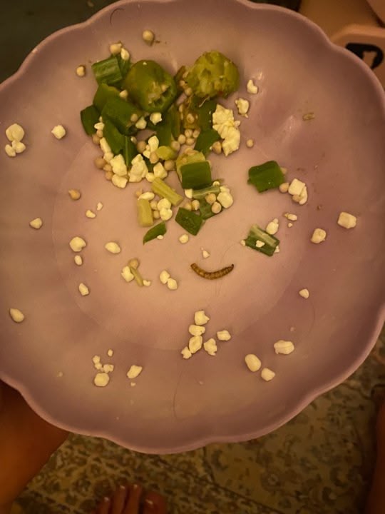 @NerdyPotato I don’t know!!! The green mush is apple, kale, and avocado puréed and I know she likes that. My guess is that’s #1. Last place is a toss up between the mealworm and the okra. This will be her first time trying cricket, though. It’s all up in the air