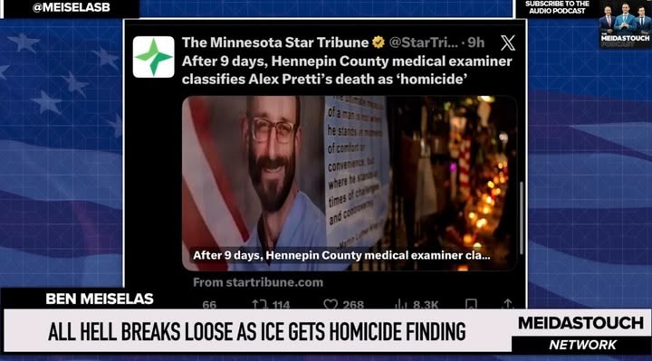 MeidasTouch host Ben Meiselas reports on Donald Trump’s ICE and Border Patrol being found to have officially committed homicide against Alex Pretti and Meiselas showcases how ICE and Border Patrol are still at in harming communities in Minnesota and accross the country as Meiselas rolls out the receipts and videos, including exclusive footage from Status Coup.