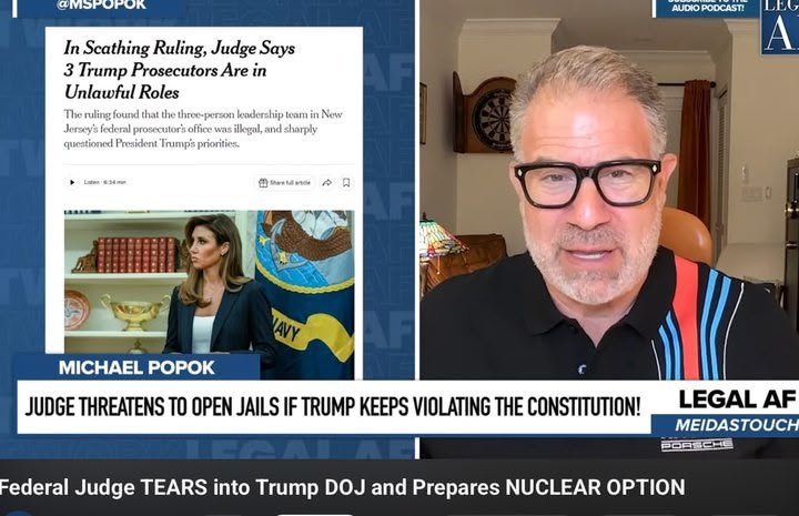 Popok reports on Chief Judge Brann warning Trump and his DOJ that if they continue to violate the law and the Constitution by appointing illegal US Attorneys' to run each federal district, he will dismiss criminal indictments and open the jails as a punishment, as Trump's efforts to have 3 people none with the title of US Attorney run the NJ office after Alina Habba's firing.