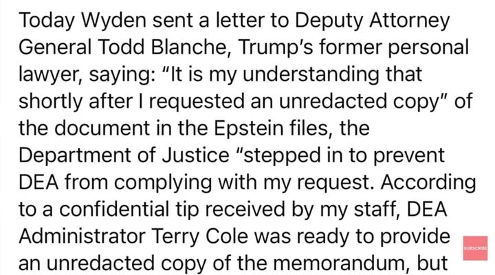 When Senator Ron Wyden asked for an unredacted copy of the report of this investigation, Deputy Attorney General Todd Blanche blocked the report from being delivered to Senator Wyden.