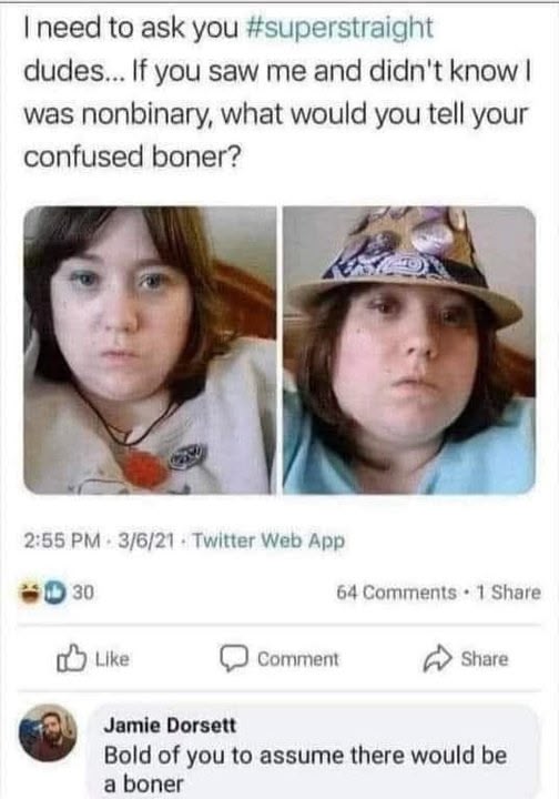 I need to ask you #superstraight dudes... If you saw me and didn't know I was nonbinary, what would you tell your confused boner? Post Comment Receive notifications Add a comment...