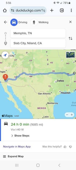 @Lilnonames Looks like he'll take I-40 all the way, in Flagstaff, Arizona, there's the Coconino National Forest that allows campers to stay for a week or so, my oldest brother and I stayed there for a week in early 1995 with his young son on our way to Tuscon, but the welding job he applied for fell through when we got there, the contractor got busted with a bunch of illegals and was in jail waiting trial.