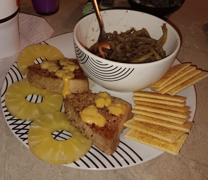 Dinner tonight is Yellowfin tuna white wine marinade and herbs with hollandaise sauce. Teriyaki green beans fresh pineapple and club crackers Post Comment Receive notifications Add a comment...