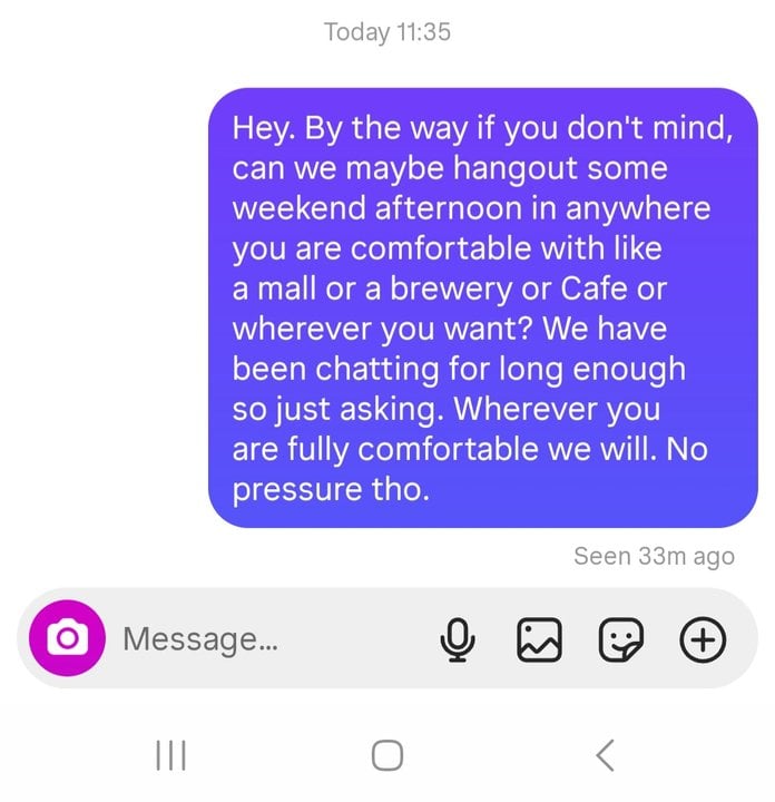Idk whether its because I am still kind of a stranger despite chatting for months and once upon a time being in the same school and we live in the same city or idk whether just like most Indian women, she is reserved or cautious about men too who aren't in a shared context with her. Its sad how Indian women are so reserved whether on Instagram or even when i initiate conversation in person via cold approach in a Cafe or bookstore of Church Street or Lavelle Road and as I am searching for a job and more in home, i am unable to meet new women as easily so relying on Instagram or cold approaching. Here is the screenshot of what I sent her so give your opinion or advice about it