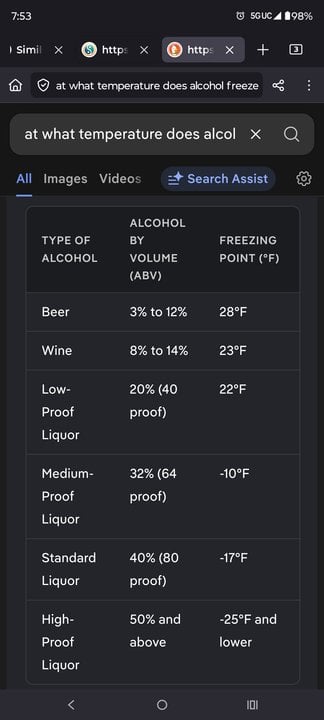 @Lilnonames all alcohol freezes. Just it's extremely cold depending on the amount of alcohol. 100% alcohol would freeze at below -173°f. While a beer at below 28°f. And wine below 23°f. 🙃