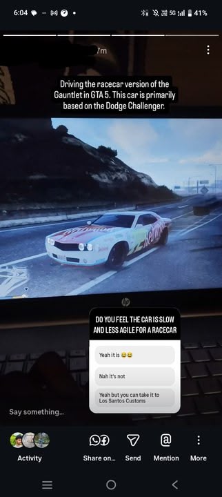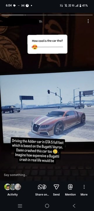 So yeah today was a boring Saturday so at afternoon I was playing GTA 5 just for fun. I also film the gameplay of me playing it and post it on Instagram stories to show to my followers who are mostly my real life peers in their 20s(mostly 21-27/28 age range). I am 25 and the game is 18+ so I am perfect age to play it but idk why it still feels like whether they will think that I seem like a kid for playing GTA 5 and posting it 🥲🥲. I wonder whether they feel I didn't grow up still and playing videogames like a kid 😂😭. Even for GTA 5 I show my car enthusiast side tho by writing in the captions how I modified Michael's car, how the Adder is based on the Bugatti Veyron, The Entity XF is based on Koenigsegg CCX etc and put polls and sliders. Do you feel me posting GTA 5 videos feel more immature to them compared to me filming supercars in real life and posting them on my Instagram stories. Here are the screenshots of my Instagram stories.
