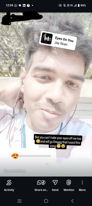So today I am going to the Central areas of our city Bangalore in India and I just bumped into the song Eyes On You by Jay Sean. Loved the song instantly. This song has made me feel energized as I will socialize with women in Church Street, Indiranagar, Lavelle Road etc so I trying to feel the Jay Sean energy and he is also of Indian origin which makes it feels even better as he sang the song when he was 23 and I am 25 now pretty much that same age band. So I took a selfie video of me and posted it on Instagram stories using this song Eyes On You and put a caption saying "Bet you all can't take your eyes off me too ๐ and go Omggg that I used this song ๐๐" and used a slider. Yeah my followers are mostly my real life peers in their 20s too mostly 21-27/28 age range and even female followers will view it too ๐