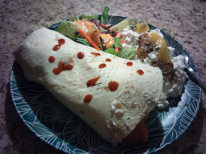 Burrito pezca California with cottage cheese and fresh peaches along with a salad served with Coke and lime