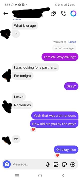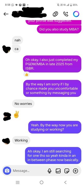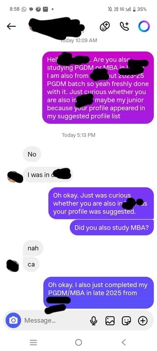 So I just messaged this woman on Instagram today(we are strangers) whose profile I found in the suggested profile list. She lives in our city Bangalore in India itself and just completed her studies and is a CA finalist and now working and I am freshly done with my MBA(PGDM degree basically) but soon the chat got strange and random as you will read the chats. She is 22 and I am 25 by the way. So read the screenshots and say whether something is off in the chats. I hid her name, our University names and all in the screenshots