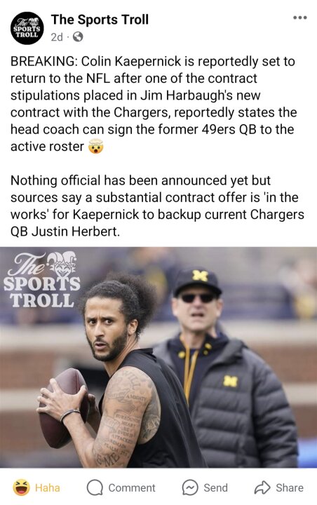 In a world where anyone even cares about football any more...who cares? I like Kaeperdick. His silly victim act is the reason I opened my eyes and saw what a bunch of woke d'bags the nfl actually is. So even though this is satire, it reminds me of just how irrelevant football has become in my life. Note...I was a former HUGE fan and Chicago Bears supporter back when football was the primary focus...not virtue signalling.