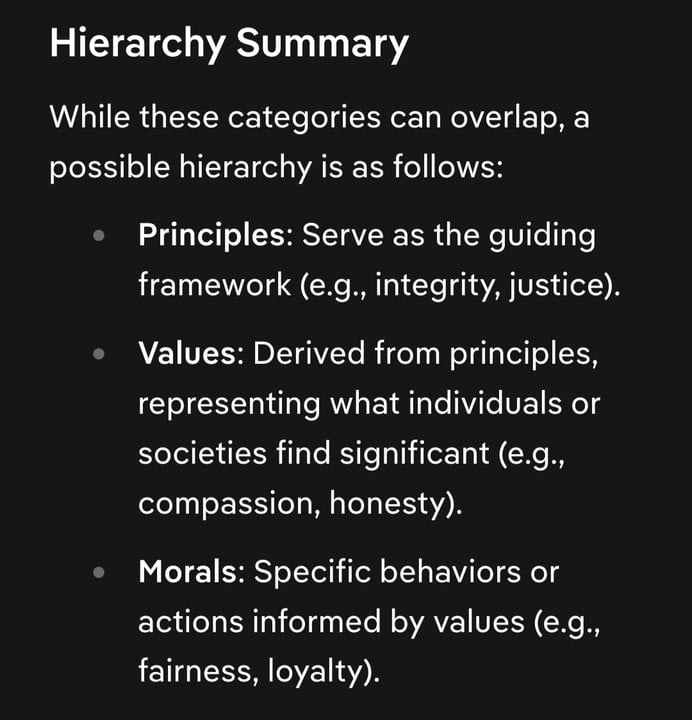 Morals: Specific behaviors or actions informed by values (e.g., fairness, loyalty).