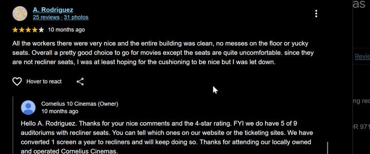 the place is entirely local and locally operated and as a Business owner with my own EIN and all it's a way to show support for a Local business I've been itching to support the only problem is Hollywood isn't making movies I want to see very often anymore. if they Carry Roofman in one of the theaters though I will be back.
