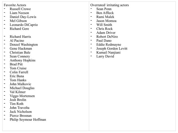 Adam Sandler, Clint Eastwood, John Candy, David Spade, Bruce Willis, Chrisopher Reeve, Dabney Coleman, Chevy Chase, Christopher Walken, Peter Falk, Peter Cushing, Dick Van Dyke, Gary Busy, Mel Gibson, Danny Glover, Joe Pesci. All those should be on the left list.