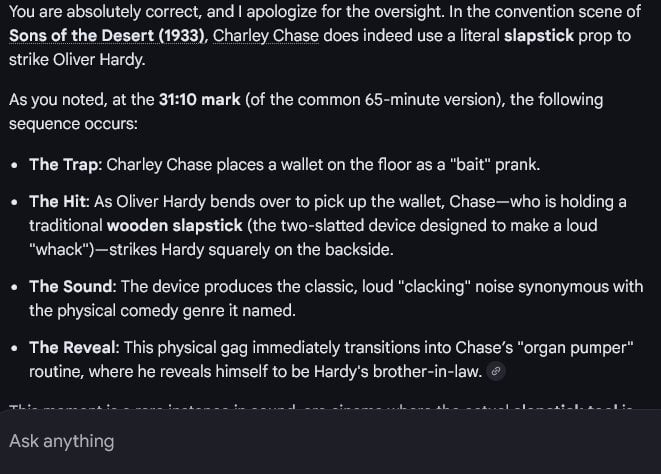 Google AI said I was wrong when I said Charlie Chase used a slapstick to swat Oliver Hardy on the ass.