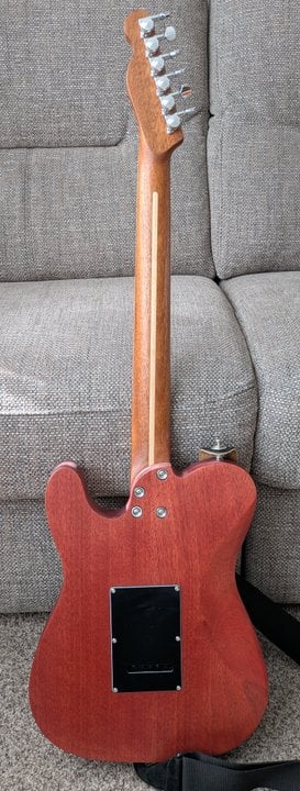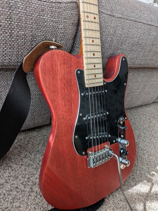 Mahogany body stained crimson red then oil and wax finish like the neck which is mahogany with maple fretboard.