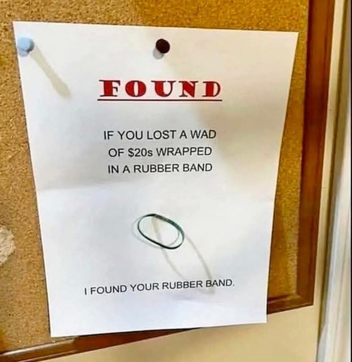Maybe "My neighbour found your rubber band"