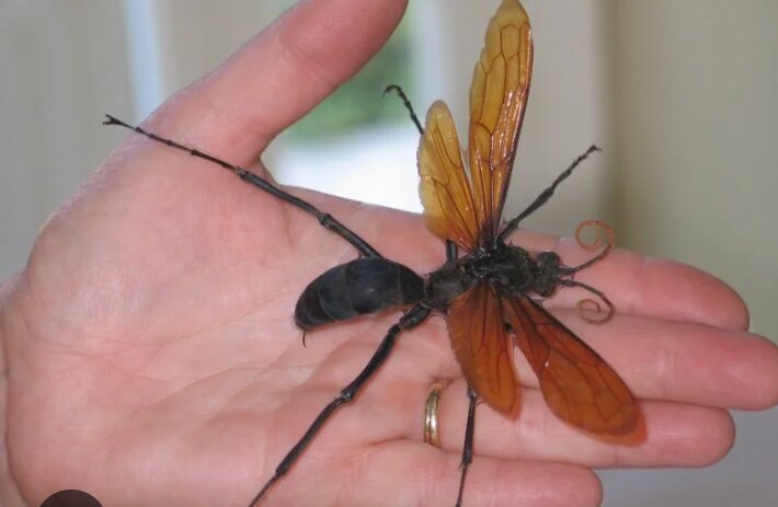 Enter the Tarantula Wasp aka. Hawk wasp aka . Tarantula Hawk wasp.. besides its macabre lifecycle it also packs the second most painful sting in the insect world. Although I think some may argue the insect part because of its size with 2-2 1/2 " abdomen .