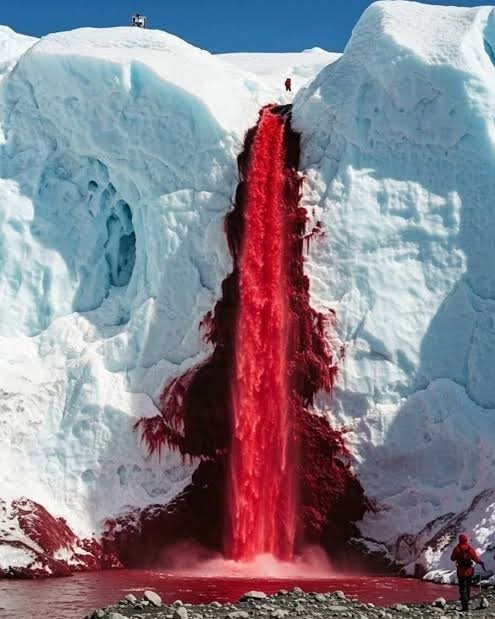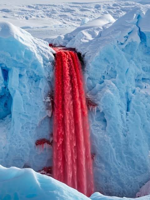 The vibrant red is caused by iron-rich brine from a subglacial lake that oxidizes upon contact with oxygen, creating iron oxides. The lake has been isolated for millions of years, trapped under about 400 meters of ice.