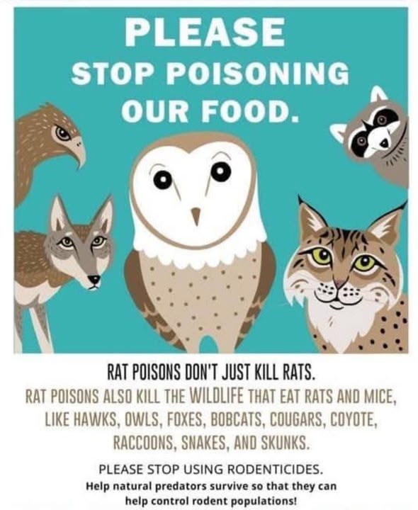 There are ways to bait & kill rodents without using poisons that would kill animals that would be consumed by other animals. Involves a mixture of foods rodents are attracted to plus baking soda. Rats and mice are unable to burp, if they get a gas buildup they die rather quickly.