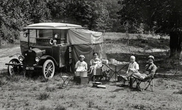 this phots was taken in 1920. I have watched recent videos of car tent camping, there is a type that the tent goes up over the top of a pickup truck or van and down to the ground in some styles. They sleep at the top part of the tent. The bottom part can hold a heater, a cooker, and other things like fuel.